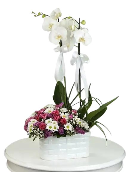 seramik vazo içerisinde beyaz çift dallı orkide ve rengarenk papatyalar